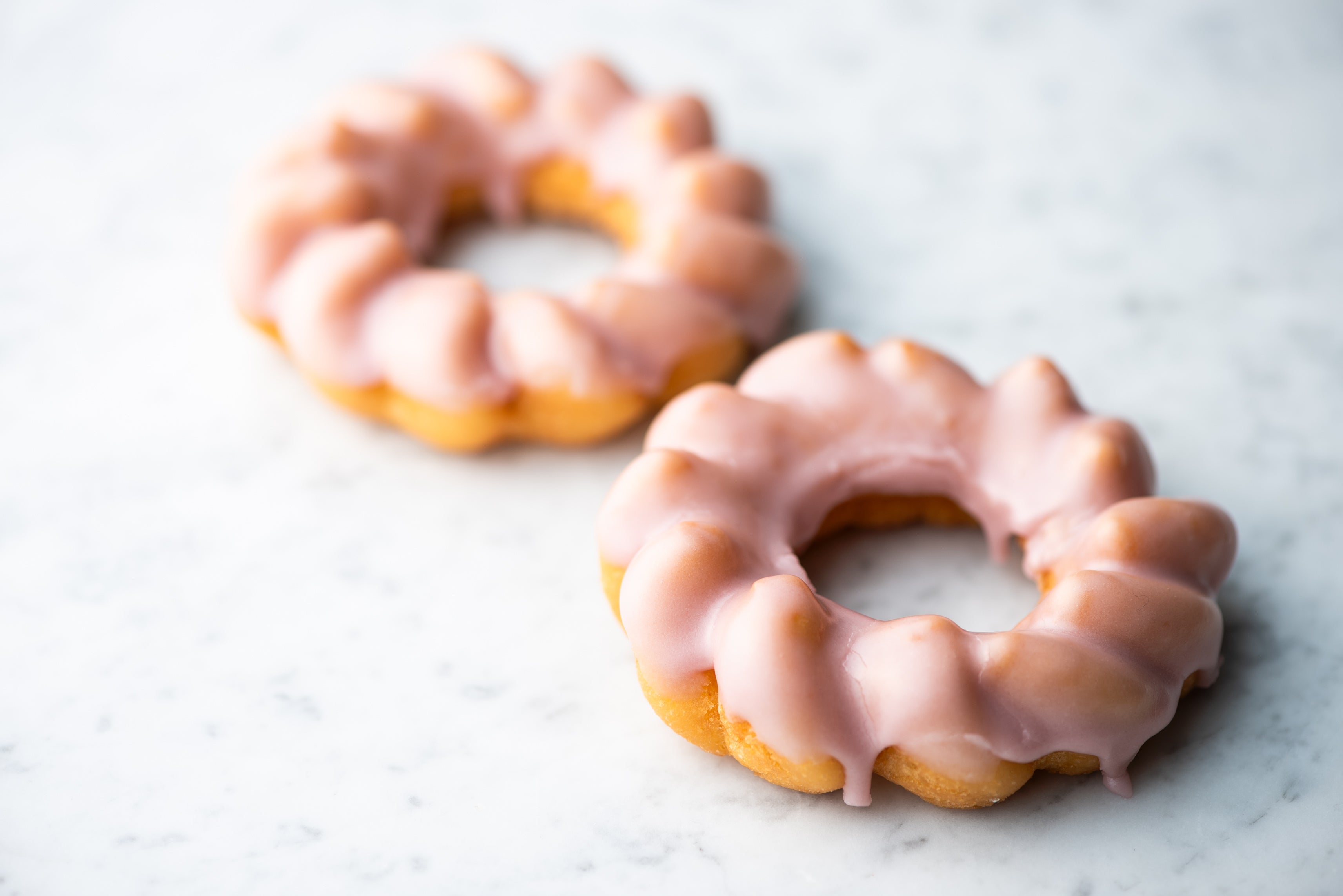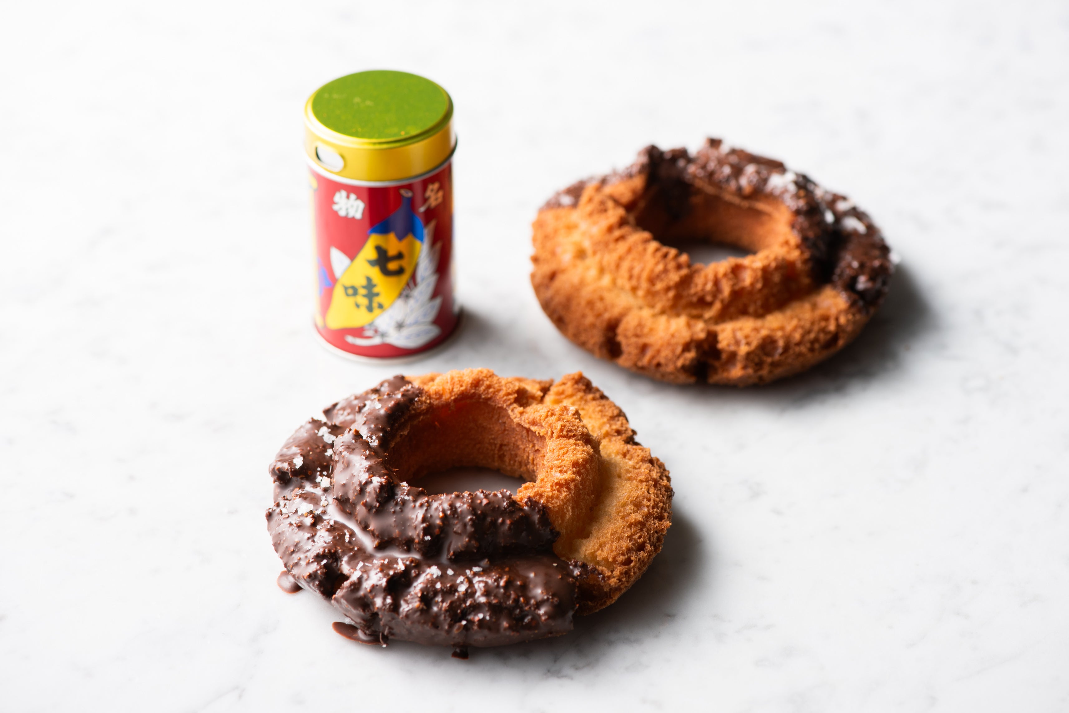 「オールドファッション七味チョコ」。八幡屋礒五郎の七味ならではの香り高い風味やしっかりとした唐辛子の辛みを活かしたドーナツに仕上げるため、七味唐辛子の配分、合わせるフレーバーなど試作を繰り返しました。また、チョコの甘みと唐辛子の辛さをバランスよく繋ぐために仕上げに塩を一振り。その結果「食べた瞬間七味がふわっと香るチョコレートドーナツ。でも後からしっかり辛い!」と、辛いもの好きにはたまらないドーナツに仕上がりました。